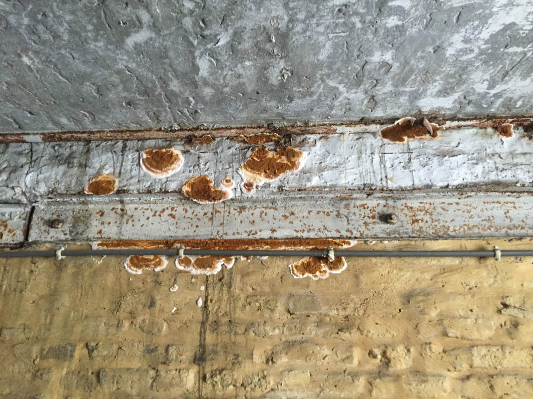 Correction sur une idée préconçue, la mérule traverse parfois la maçonnerie mais ne la détruit pas, c’est la boiserie qui sera détruite.